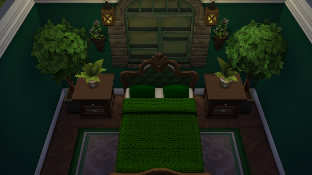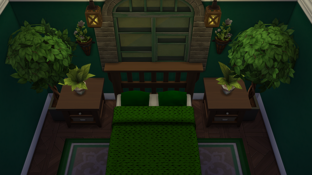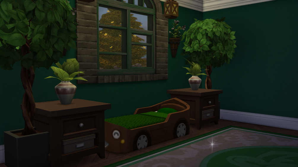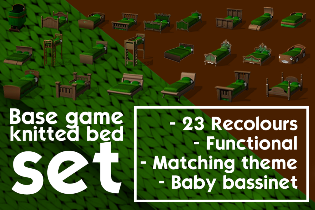 A recolour of all the basic beds (minus the pullout cot because it kept glitching out). A cozy green knitted blanket on a warm-toned headboard for that cottage core rainy day vibe. Includes the bassinet.